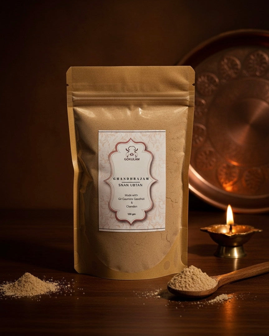 Chandan or Gandharajam, is a treasured Ayurvedic ingredient renowned for its beauty-enhancing properties and auspicious significance. Gandharajam Snan Ubtan combines this ingredient with other herbal extracts, cooling, calming, and aromatic properties to repair, rejuvenate, and nourish the skin. Regular use reveals a radiant glow, cleanses pores, tones skin, enhances complexion, and soothes skin ailments, awakening natural beauty and serenity.