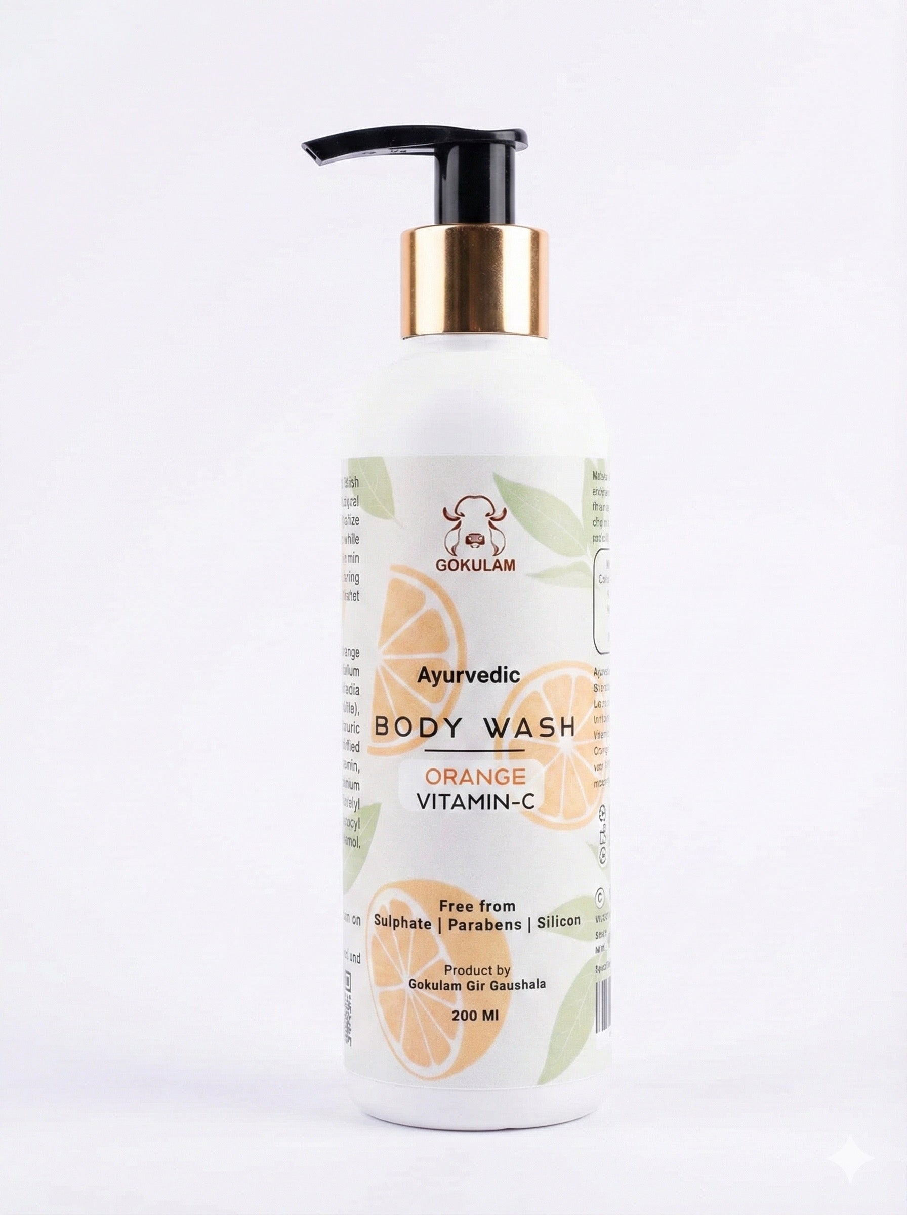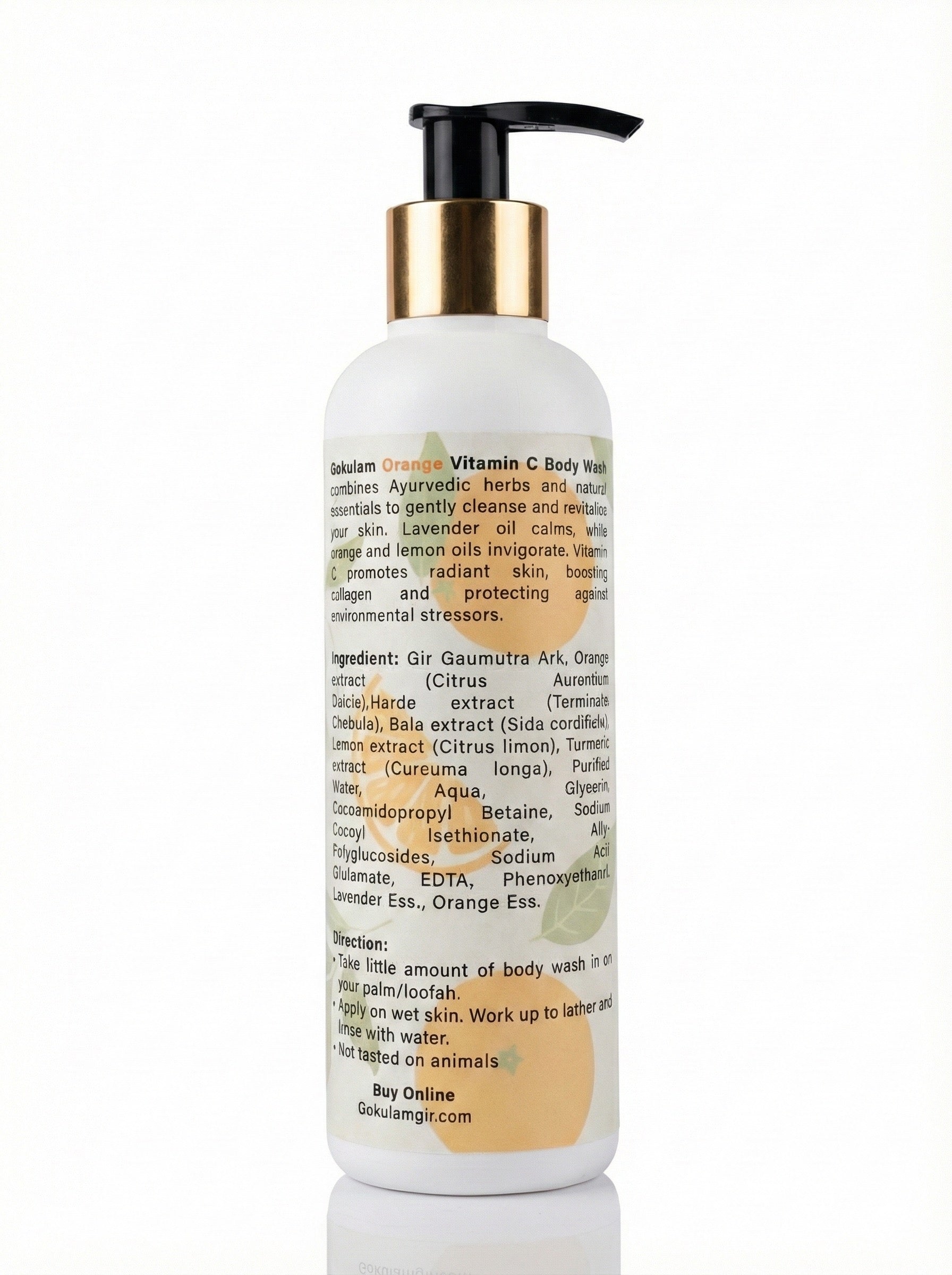 Ingredient: Gir Gaumutra Ark, Orange extract (Citrus Aurantium Dulcis),Harde extract (Terminalia Chebula), Bala extract (Sida cordifolia), Lemon extract (Citrus limon), Turmeric extract (Curcuma longa), Purified Water, Aqua, Glycerin, Cocoamidopropyl Betaine, Sodium Cocoyl Isethionate, Alkyl Polyglucosides, Sodium Acyl Glutamate, EDTA, Phenoxyethanol.